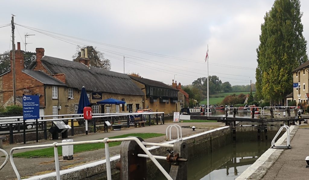 Pea Green’s tiller, looking along the towpath towards the tunnel at Stoke Bruerne.